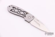 "Mind teasing innovation is put into motion in this cutting edge design. An ingenious mechanical LEVITATOR™ system in the stainless steel handle scale leverages the spring/pin system to effectively lock the blade open and closed. The stylish blade shape makes the cut with its high-grade blade steel. A multitude of laser cut and precision machined components come together in a pocket friendly representation of modern engineering wizardry." Excellent Condition. Comes with original box and papers.