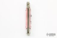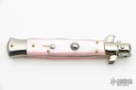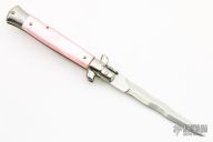 This 9" Swivel bolster auto by Armondo Beltrame features a mirror polished Kris blade with false top edge. The handle has stainless steel bolsters, front and rear, pick acrylic scales, brass liners, stainless steel backspacer and spring. Nice action, lockup and blade seating. Has safety. Excellent condition.