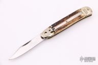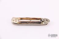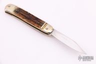 This leverlock auto by Hubertus features a clip point blade, nickel silver double bolsters, stag scales, and brass liners and pins. Opens with a nice snap. Very fast opening. Has some patina and light scratches, otherwise excellent condition.