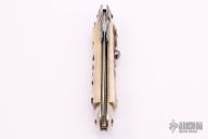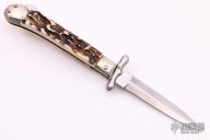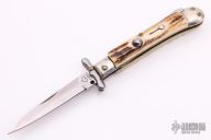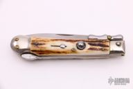 This Automatic knife features a spear point blade with false top edge, nail nick, and nickel silver swing guard. The handle has nickel silver bolsters, front and rear, stag scales, brass liners. Has some light scratches, otherwise excellent condition. Has safety.