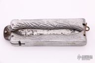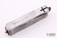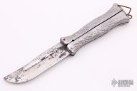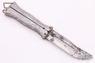 This Balisong features satin finished clip point blade with fullers. The handle is composed of two cast aluminum pieces. Scuffs, scratches and oxidation are visible on blade and handle.