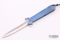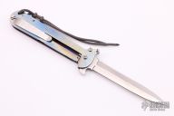 This KGB Dagger Prototype by Rob Dalton features a satin finished double-edged blade. The handle has an anodized and orange peel finished titanium frame with tip up satin finished titanium clip. Nice detent, lockup and blade seating. Excellent condition.