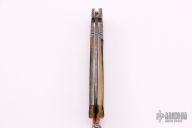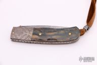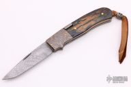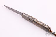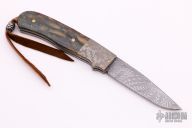 This Mid-Lock by W.D. Pease features a Robert Eggerling "Feather" Damascus blade with nail nick. The handle is comprised of dovetailed Robert Eggerling Mosaic Damascus bolsters, beautiful bark mammoth ivory scales, stainless steel liners and fileworked lockbar/backspacer, gold-plated screws. Comes with a zippered case. Excellent condition.