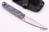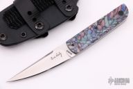 This Small Knife by Bud Nealy (#9537) has a hand rub satin finished blade with false top edge, full tang and notched thumb and finger rests, .142" blade stock and .776" blade depth. Handle has acrylic scales with black pins. Has a few light scratches, otherwise excellent condition. Comes with kydex sheath.