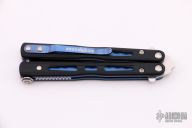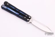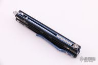 This Model 32 Morpho Balisong by Benchmade has a stone washed spear point D2 stainless steel blade. Handle is black G-10 with blue anodized titanium liners and milled stainless steel spacers. Blue anodized titanium tip up clip. Comes with original box and papers. Excellent condition.