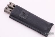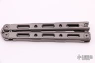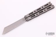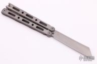 This Model 87 Balisong by Benchmade features a tumble finished wharncliffe style blade. The handle is comprised of an integrally constructed, skeletonized titanium frame with bead blast finish. Spring-loaded T latch on pommel. Comes with original box and papers. Excellent condition.