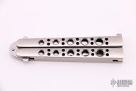 This is a Benchmade Model 10S Bali-Song with a partially serrated blade. The handles are stainless steel with a T-latch. Has a few light scratches, otherwise good condition. Comes with original sheath.
