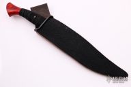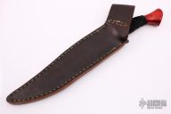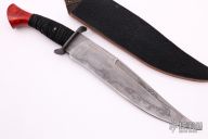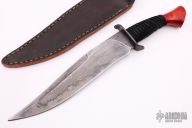 This Spirit Bowie by Shiva Ki features a clay tempered 1095 carbon steel clip point blade with a sharpened top edge, .228" blade stock and 2.312" blade depth, hidden tang construction. The handle is comprised of a Damascus guard and cord wrap over rayskin with a dyed curly maple grip over hidden tang construction. Includes leather sheath with belt loop and black stingray skin overlay. Has some scratches on the blade and a small ding on the wood handle, otherwise excellent condition. I believe this knife is a takedown model I didn't try to take it down because of the sharpened top edge.