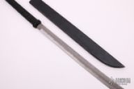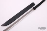 This sword by Don Fogg features a bead blasted blade with satin finished bevels and forge finished flats, .275" blade stock and 1.675" blade depth, full tang construction with black epoxied cord over yellow cord, Turks head knot guard. Comes with a black wooden scabbard. Excellent condition. Very cool piece by Don Fogg.