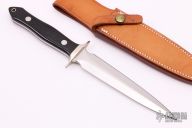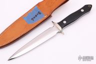 This dagger by Walter Brend features a mirror polished double-edged blade, .175" blade stock and 1.052" blade depth, full tapered tang construction. The handle has a nickel silver guard with black linen micarta scales. Comes with a brown leather sheath. Excellent condition.