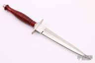 "This model was based on the Fairbairn-Sykes commando knife of World War II and was featured on the cover of the Combat Knives magazine in 1998." This "Exterminator" by William Keeton features a double-edged mirror polished blade with .237" blade stock and .915" blade depth, hidden tang construction. The handle has a nickel silver guard and butt with winewood fluted grip. Well balanced with a nice feel in the hand. Very nice work. Excellent condition.
