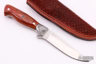 This fixed blade by Lowell Bray features a satin finished drop point blade with .184" blade stock and 1.048" blade depth, full tang construction. The handle has dovetailed and engraved stainless steel bolsters, black spacer and giraffe bone scales with mosaic and stainless steel pins, and a fileworked tang. Includes a hand tooled brown leather sheath with belt loop. New from maker.