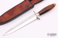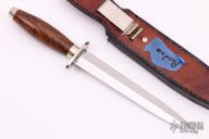 This Dagger by Mel Pardue features a double-edged mirror polished blade with .170" blade stock and 1" blade depth, hidden tang construction. The handle has a nickel silver guard and butt with cocobolo grip. Comes with a brown leather sheath, but the snap is broken. Excellent condition. Dated 11-77