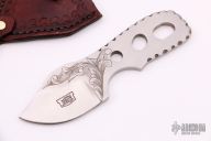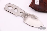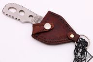 This neck knife by Lowell Bray features a satin finished blade with engraved flats, fileworked tang and holes in tang, .201" blade stock and 1.484" blade depth, full tang construction. Comes with a hand tooled brown leather sheath. New from maker.