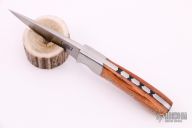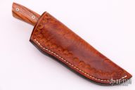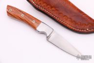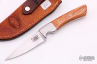 This small hunter by Lowell Bray features a hand rub satin finished blade with .189" blade stock and .913" blade depth, full tang construction. The handle has dovetailed stainless steel bolsters, giraffe bone scales with mosaic pins, fileworked tang. Comes with a hand tooled brown leather sheath. New from maker.