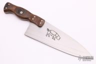 This Chef's Knife by Lowell Bray features a satin finished blade, .094" blade stock and 2.794" blade depth, full tang construction. The handle has green canvas micarta scales with nickel silver and mosaic pins. New from maker.