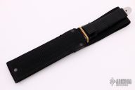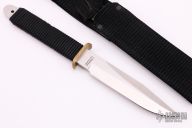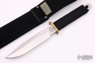 This EK Commando Bowie has a satin finished clip point blade with full tang and false top edge. Blade width .187", depth 1.249". Handle has black paracord wrap with a brass guard and lanyard hole. Excellent condition. Comes with nylon sheath with velcro closure and belt loop.