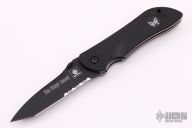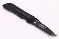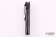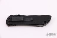 This knife features a black tanto style blade with partial serrations and a thumb disc. The handle features black textured G10 scales over titanium liners a black tip down pocket clip. Includes the original box. Excellent condition.
