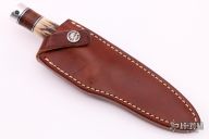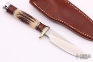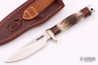 This Model 26 Pathfinder by Randall Made Knives is one of Randall's best-selling models. It features a drop point satin finished blade with .159" blade stock and .951" blade depth, hidden tang construction. The handle has a nickel silver guard and duralumin butt, stag grip and black/aluminum/leather spacers. Comes with brown leather sheath and zippered case. Excellent condition.