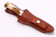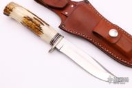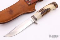 This Morseth Stag Hunter has a satin finished clip point blade with hidden tang, .178" blade stock and .971" blade depth. Handle is stag antler with a nickel silver guard and black, white and red spacers. Comes with custom Morseth brown leather sheath with belt loop. Has some scratches on the blade, otherwise good condition.
