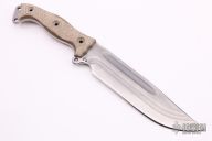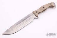 This Nuclear Forsaken Steel Hear by Busse features a competition finished clip point blade with fullers and corrugated bevel technology, .211" blade stock and 1.792" blade depth, full tang construction. The handle has green canvas micarta scales, extended tang with lanyard hole. Excellent condition.