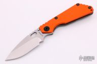 This Mick Strider SNG framelock folder features a stonewashed blade with thumbhole and notched thumbrest. The handle has an orange G-10 and flamed titanium frame with titanium clip, tip up carry. Jimping on blade spine. Nice lockup, and blade seating. New condition.