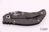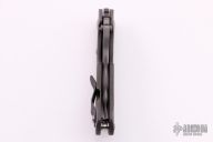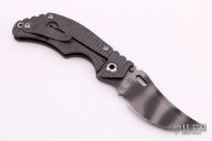 This KRT by Strider Knives features a tiger stripe upswept blade with thumbhole and notched thumbrest. The handle has a flame finished titanium frame with a matching titanium tip up clip. Nice detent, lockup and blade seating. New condition.