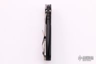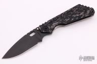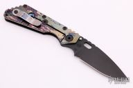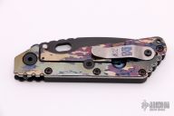 This SMF by Mick Strider features a black blade with notched thumbrest and thumbhole. The handle has a aluminum and titanium frame, with tip up titanium clip. Handle finish is "A-Tacs Camo". Nice detent, lockup and blade seating. Has a few light scuffs, otherwise excellent condition.