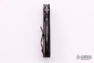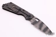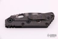 This Mick Strider SNG Fatty framelock folder features a tiger striped blade with thumbhole and notched thumbrest. The handle has a black aluminum and flamed titanium frame with titanium clip, tip up carry. Jimping on blade spine. Nice lockup, detent, and blade seating. New condition.