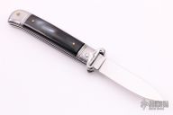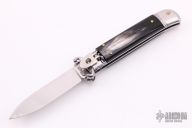 This Lever Lock Auto has a mirror polished stainless steel spear point blade. Handle has buffalo horn scales, steel front and rear bolsters, stainless steel liners and a nickel silver lock release button. Excellent Condition.