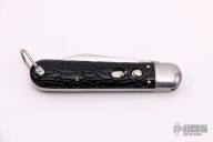 This antique auto by Presto features a clip point blade. The handle has nickel silver bolsters, jigged black scales, steel liners and backspacer, has safety. Nice action, blade seating and lockup. Has some light scratches, otherwise excellent condition.
