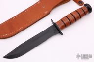This KA-BAR USMC Fighting Knife has a carbon steel black clip point blade, marked "KA-BAR/ Olean, N.Y. USMC", and steel double guard. Blade stock is .174", depth 1.233". Handle is stacked leather with a 3/8" pinned butt cap. Excellent condition. Includes original box, papers and brown leather sheath with belt loop.