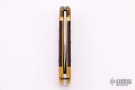 This Buck 112 features a satin finished clip point blade with nail nick. The handle has a brass frame with wood scales and a stainless steel backspacer. Comes with original black leather sheath and original box. Has some light patina, otherwise excellent condition.