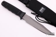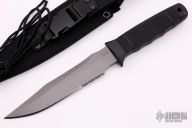This Seal 2000 Fighter by SOG Knives has a grey coated partially serrated clip point blade with hidden tang, .236" blade stock and 1.378" blade depth. Handle is contoured glass reinforced nylon with lanyard hole. Comes with nylon sheath and original box and papers. Excellent condition.