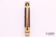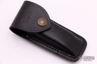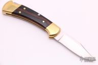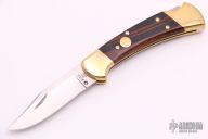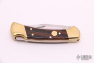 This BUCK 112 is an automatic conversion. It is the real deal. Beautiful piece with brass bolsters and dark wood scales. Trigger button is on the A side and is brass. Strong action. Excellent condition except for patina on the brass. Comes with leather sheath and original box.