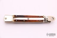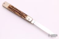 This leverlock auto by Hubertus features a spear point blade, nickel silver double bolsters, stag scales, and brass liners and pins. Opens with a nice snap. Very fast opening. This is the largest automatic knife that Hubertus Makes. Has some patina and light scratches, otherwise excellent condition.