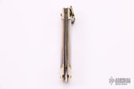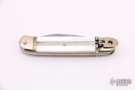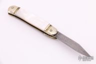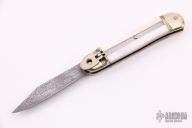 This leverlock auto by Hubertus features a Damascus blade, nickel silver double bolsters, mother-of-pearl scales, and brass liners and pins. Opens with a nice snap. Very fast opening. Has some patina and light scratches, otherwise excellent condition.
