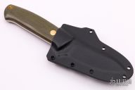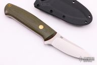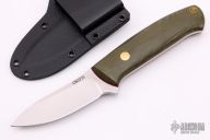 This Model 23 Semi-Skinner by Dan Crotts features a satin finished blade, .120" blade stock and .975" blade depth, full tang construction. The handle has green canvas micarta scales with red G-10 liners and brass pins and lanyard hole. Comes with a kydex sheath with horizontal carry.  New from maker.