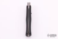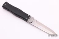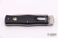 This Leverlock Auto by Mikov Knives features a polished spear point blade with false top edge. The handle is comprised of steel bolsters, lever and pins with black plastic scales over steel liners and backspacer. Strong leaf spring action. Has some scratches, otherwise excellent condition.