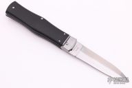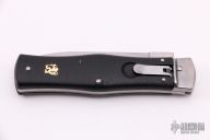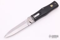 This Leverlock Auto by Mikov Knives features a polished spear point blade with false top edge. The handle is comprised of steel bolsters, lever and pins with black plastic scales over steel liners and backspacer. Strong leaf spring action. Has some scratches, otherwise excellent condition.