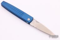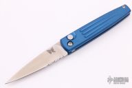 This 1000S Spike by Benchmade features a satin finished partially serrated blade. The handle is comprised of a blue anodized aluminum handle. Strong coil spring action. Excellent condition.