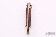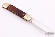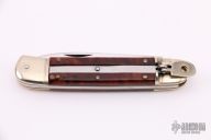 This leverlock auto by Hubertus features a spear point blade, nickel silver double bolsters, wood scales, and brass liners and pins. Opens with a nice snap. Very fast opening. Has some patina and light scratches, otherwise excellent condition.