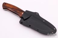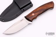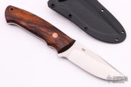 This custom hunter by Dan Crotts features a satin finished clip point blade with false top edge, .121" blade thickness and 1.173" blade depth. Full tang construction. The handle has orange Desert ironwood scales with copper pins and a lanyard hole. Comes with kydex sheath. Great fit and feel in the hand. Need from Maker.