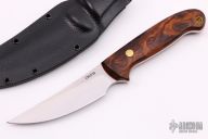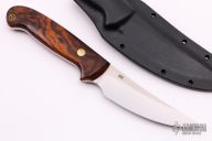 This skinner from Dan Crotts features a satin finish upswept blade. .122" blade stock and 1.125" blade depth. The handle features Desert Ironwood scales with red liners and a brass pin and lanyard tube over full tang construction. Includes kydex sheath with belt loop set up for horizontal carry. New from maker.