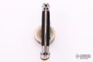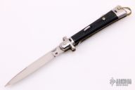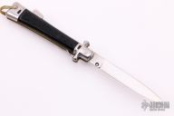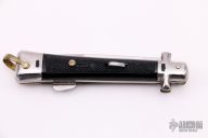 This Automatic by Bargeon features a mirror finished drop point blade with swedge. The handle has stainless steel bolsters and pommel with checkered plastic scales over coin edged brass liners and stainless steel lockbar. Push button release, sliding safety and brass lanyard bail. Has a few light scratches, otherwise excellent condition.