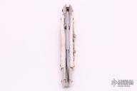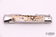 This Swing Guard Lockback Auto by AKC Italy has a polished stainless steel spear point blade with false top edge. Handle has stag scales with stainless steel bolsters, brass liners, and stainless steel back spacer and lock. Has safety. Has a few light scratches, otherwise excellent condition.