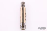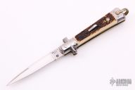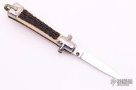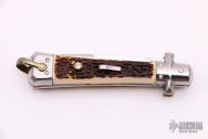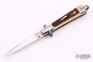 This Automatic by Bargeon features a mirror finished drop point blade with swedge. The handle has stainless steel bolsters and pommel with simulated stag plastic scales over coin edged brass liners and stainless steel backspacer. Push button release, sliding safety and brass lanyard bail. Has a few light scratches, otherwise excellent condition.