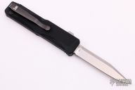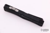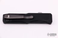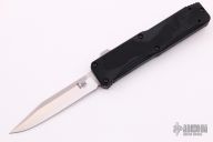Double action OTF auto by Heckler and Koch with a satin clip point blade. Black aluminum frame with tip down black stainless clip, left or right reversible. Excellent condition. Comes with original box and papers.