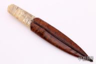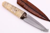 "I make mostly daggers, fighters and what I call “Kwaikens” but also swords and folding knives. I primarily use 1050 carbon spring steel and damascus of various compositions and on occasion, stainless steel for the blades. For the 1050 I employ a clay “tempering” technique that gives the blade a beautiful temper line (hamon) as well as a hard edge while maintaining a flexible core of the blade. These blades are rough ground and then finished off by hand with files and sandpaper before the final stage of etching the blade to bring out the hamon. When it comes to damascus, I tend to lean towards a simpler random or a twist pattern that goes with the overall simplistic scheme of my knives. These blades are worked and finished in a similar fashion as the carbon steel ones. I use stainless steel, mostly Damasteel stainless damascus, for folders, art knives ( for ex. Skull Cleaver and Druid Sickle) and some full-tang dress-knives, my Tuxer model, or upscale hunting/skinning-knives. For the handles and wooden sheaths I use rare exotic hardwoods, ancient ivories and bone material from all over the world. Even large pieces of natural amber has found its way onto a couple of my knives. A few wood favorites are Snakewood for its amazing striped grain pattern, Masur birch, Eucalyptus , and Redwood burl for its sometimes silky appearance."