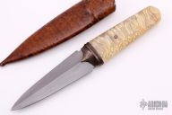 This dagger by Anders Hogstrom features a double-edged blade with beautiful multilayer hamon, .244" blade stock and 1.454" blade depth, hidden tang construction. The handle has a textured and fluted bronze guard, beautiful muskox grip with a domed bronze pin. Comes with a hand tooled brown/black leather sheath and a velcro case. New from maker. The handle material on this knife is out of this world.